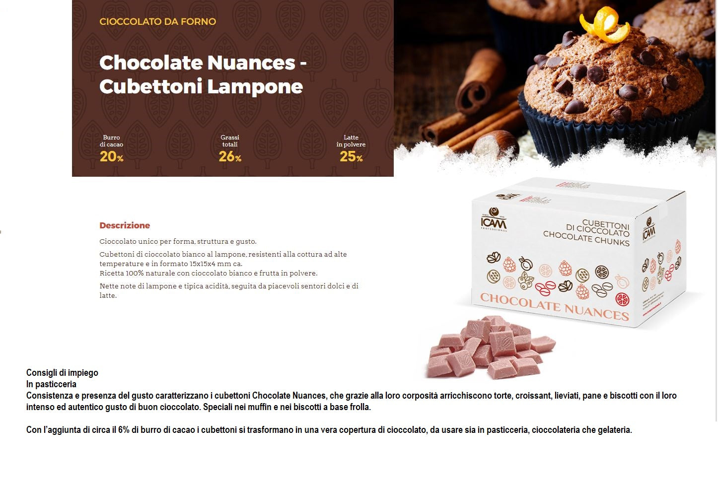 Cubettoni di cioccolato bianco al lampone, resistenti alla cottura ad alte temperature e in formato 15x15x4 mm ca.