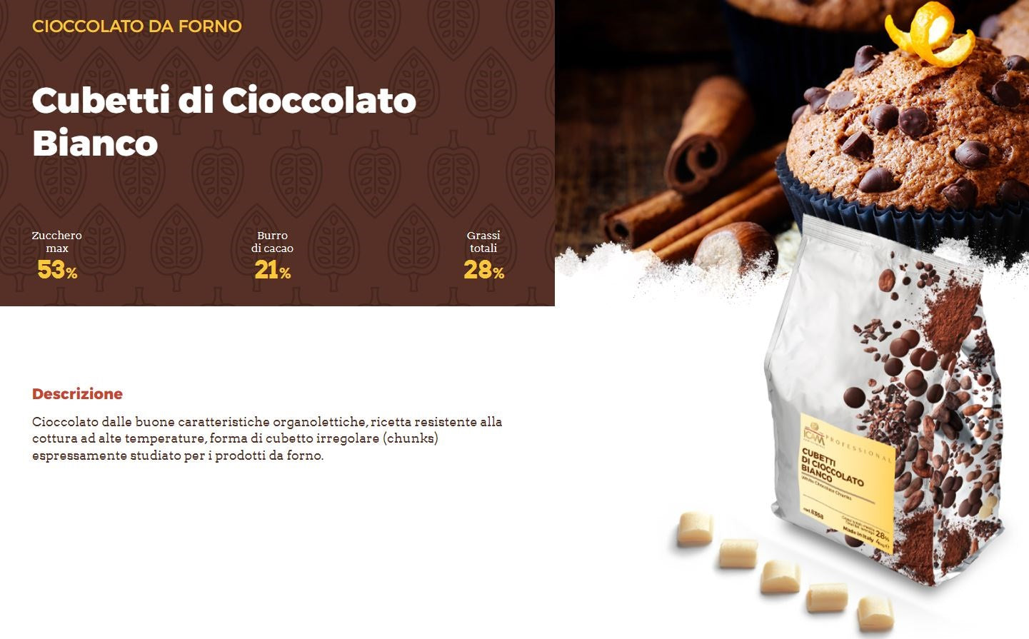 ubetti di cioccolato bianco che, restando stabili in cottura, sono perfetti come inclusioni per panettoni, muffins. cookies e pani al cioccolato. Grassi totali 28%. Sacchetto richiudibile da kg 4.
