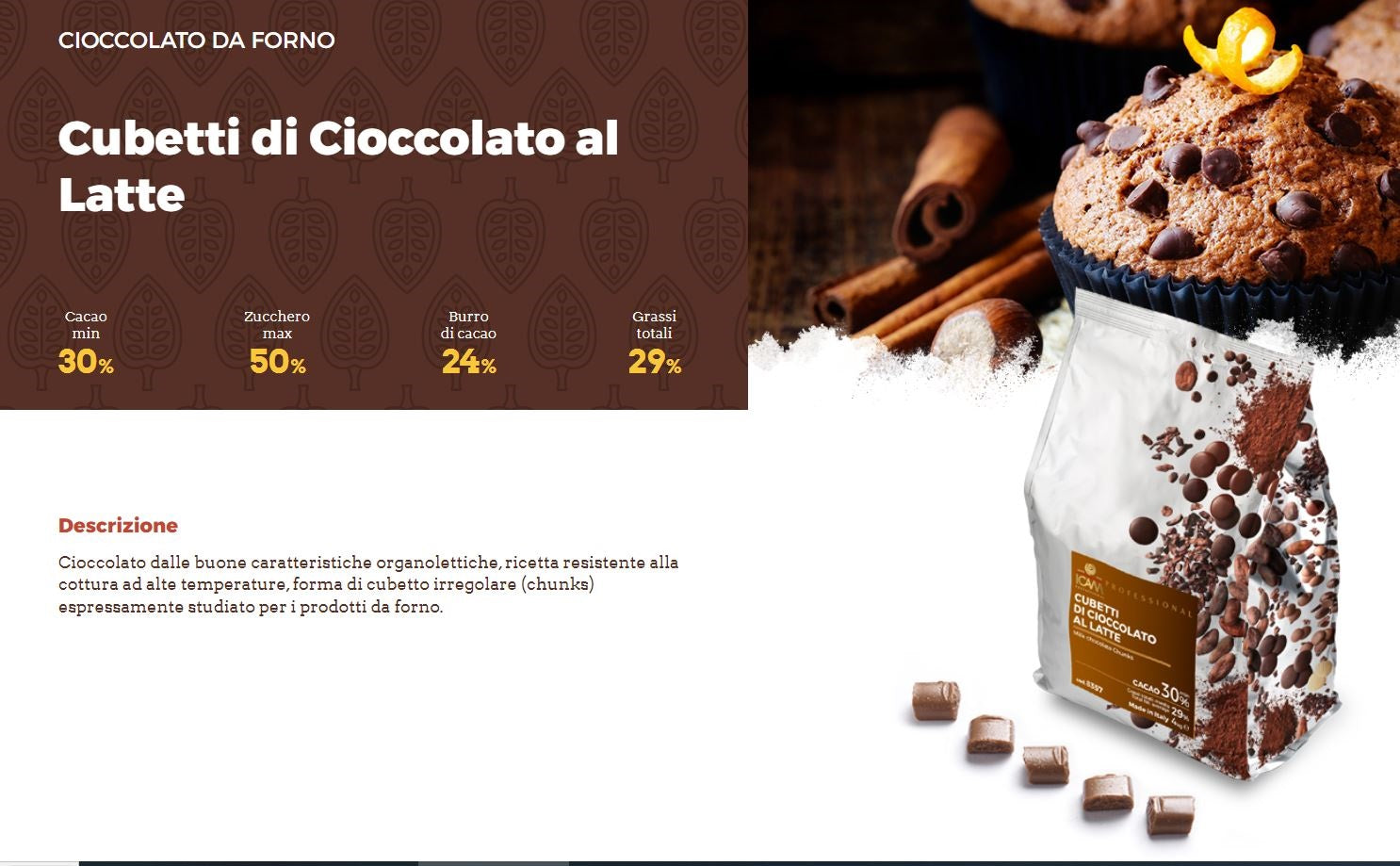 Cioccolato dalle buone caratteristiche organolettiche, ricetta resistente alla cottura ad alte temperature, forma di cubetto irregolare (chunks) espressamente studiato per i prodotti da forno.