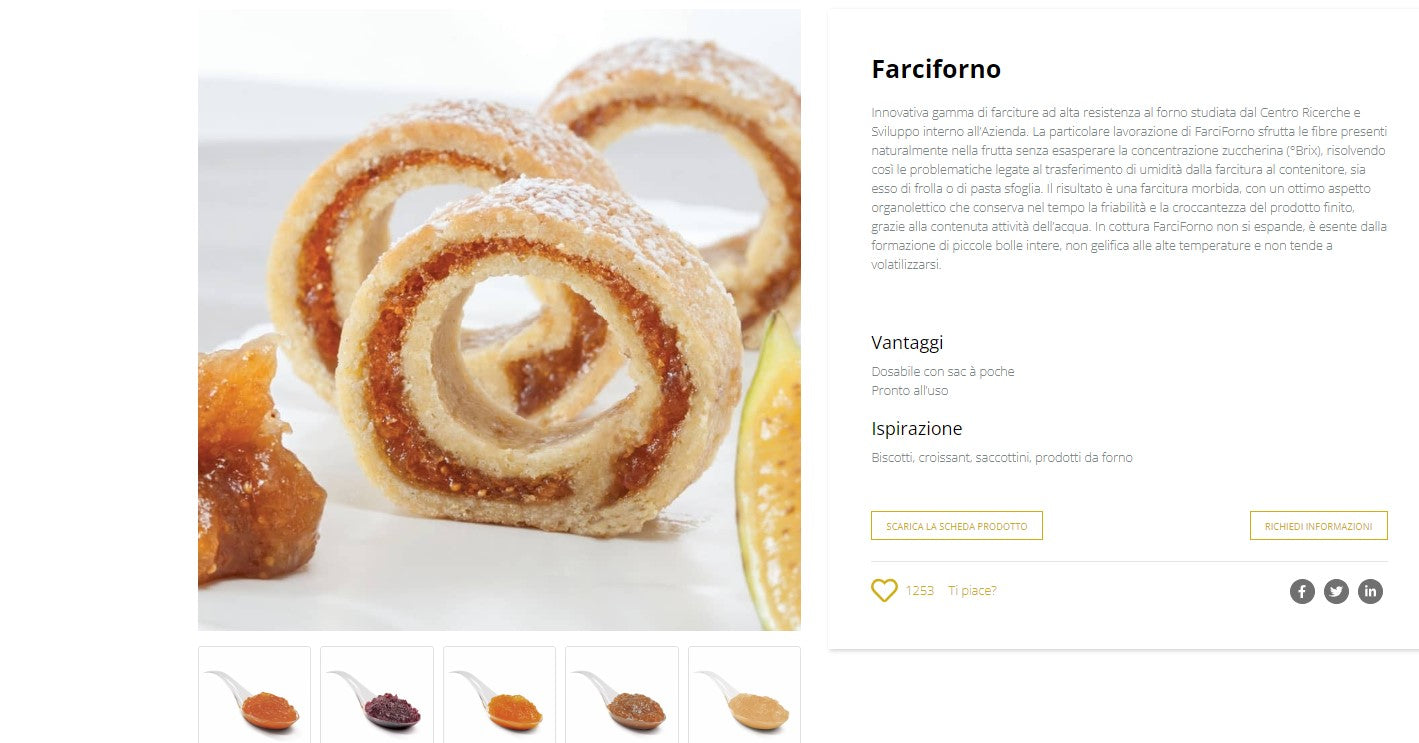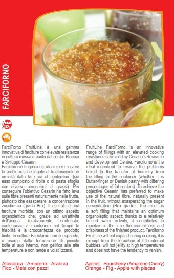 Innovativa gamma di farciture ad alta resistenza al forno studiata dal Centro Ricerche e Sviluppo interno all’Azienda. La particolare lavorazione di FarciForno sfrutta le fibre presenti naturalmente nella frutta senza esasperare la concentrazione zuccherina (°Brix), risolvendo così le problematiche legate al trasferimento di umidità dalla farcitura al contenitore, sia esso di frolla o di pasta sfoglia. Il risultato è una farcitura morbida, con un ottimo aspetto organolettico che conserva nel tempo la friabilità e la croccantezza del prodotto finito, grazie alla contenuta attività dell’acqua. In cottura FarciForno non si espande, è esente dalla formazione di piccole bolle intere, non gelifica alle alte temperature e non tende a volatilizzarsi.