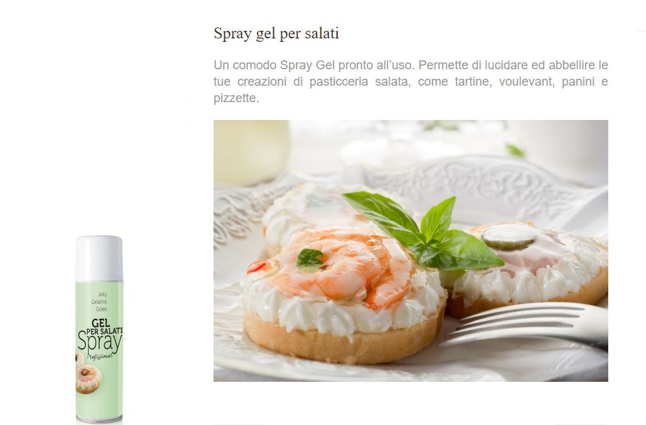 Un comodo Spray Gel pronto all’uso. Permette di lucidare ed abbellire le tue creazioni di pasticceria salata, come tartine, voulevant, panini e pizzette.