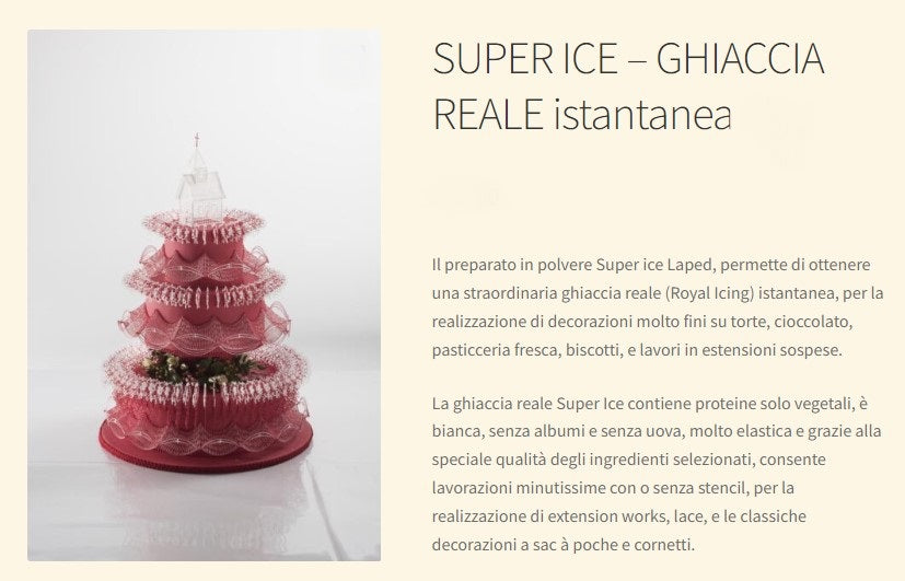 Il preparato in polvere Super ice Laped, permette di ottenere una straordinaria ghiaccia reale (Royal Icing) istantanea, per la realizzazione di decorazioni molto fini su torte, cioccolato, pasticceria fresca, biscotti, e lavori in estensioni sospese.