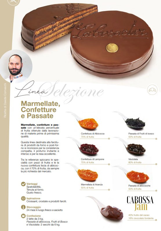 Marmellate, confetture e passate con un’elevata percentuale di frutta ottenute dalla lavorazione di materie prime di primissima qualità. Questa linea di prodotti destinati alla farcitura di prodotti da forno e post-forno si riconoscono per la consistenza compatta, il profumo invitante e intenso e per la resa eccellente. Tra le referenze spiccano le specialità con pezzi di frutta e le la nuova confettura liscia di albicocca, con il 70 % di frutta, da sempre la più richiesta dal mercato.